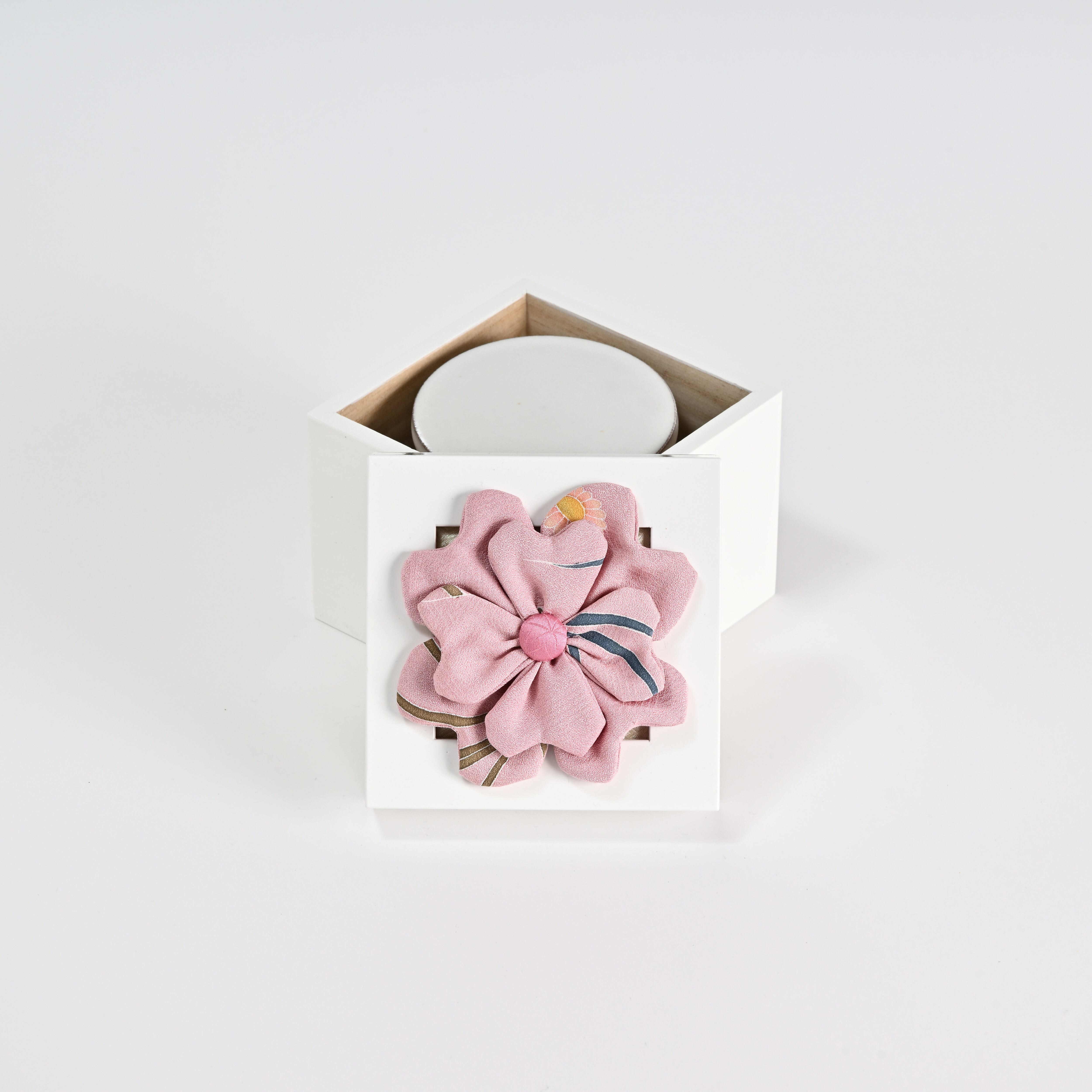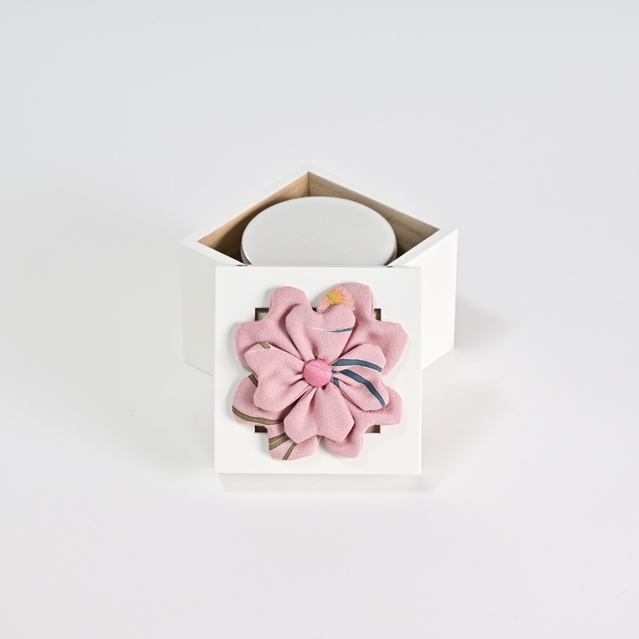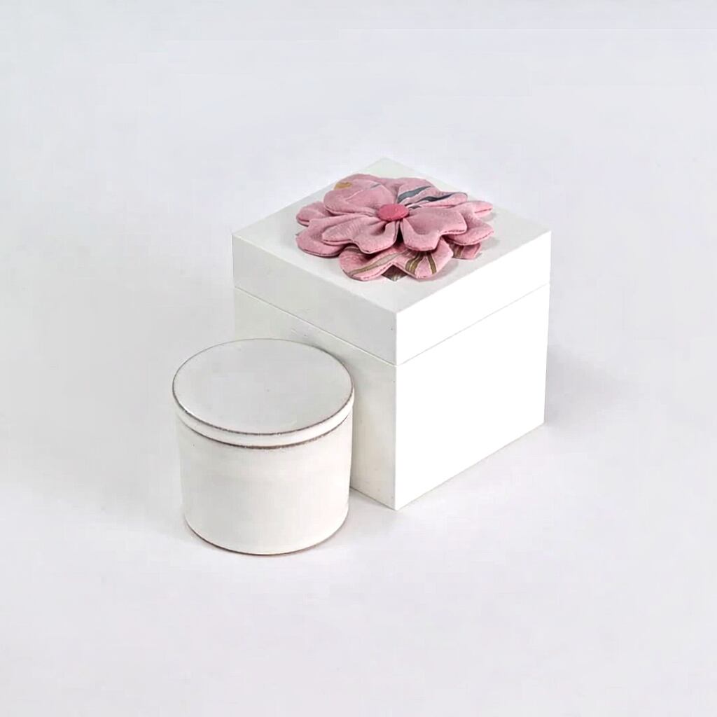 昭和29年創業の桐箱製造会社、工場併設の当店では、桐箱一筋40年の熟練職人監修の安心感安定感があります。また蓋上部のメッシュワークまたはダブルクローバーはパッチワーク師範科卒業のパッチワーク講師「村井圭子氏」が丁寧に作り込みました。