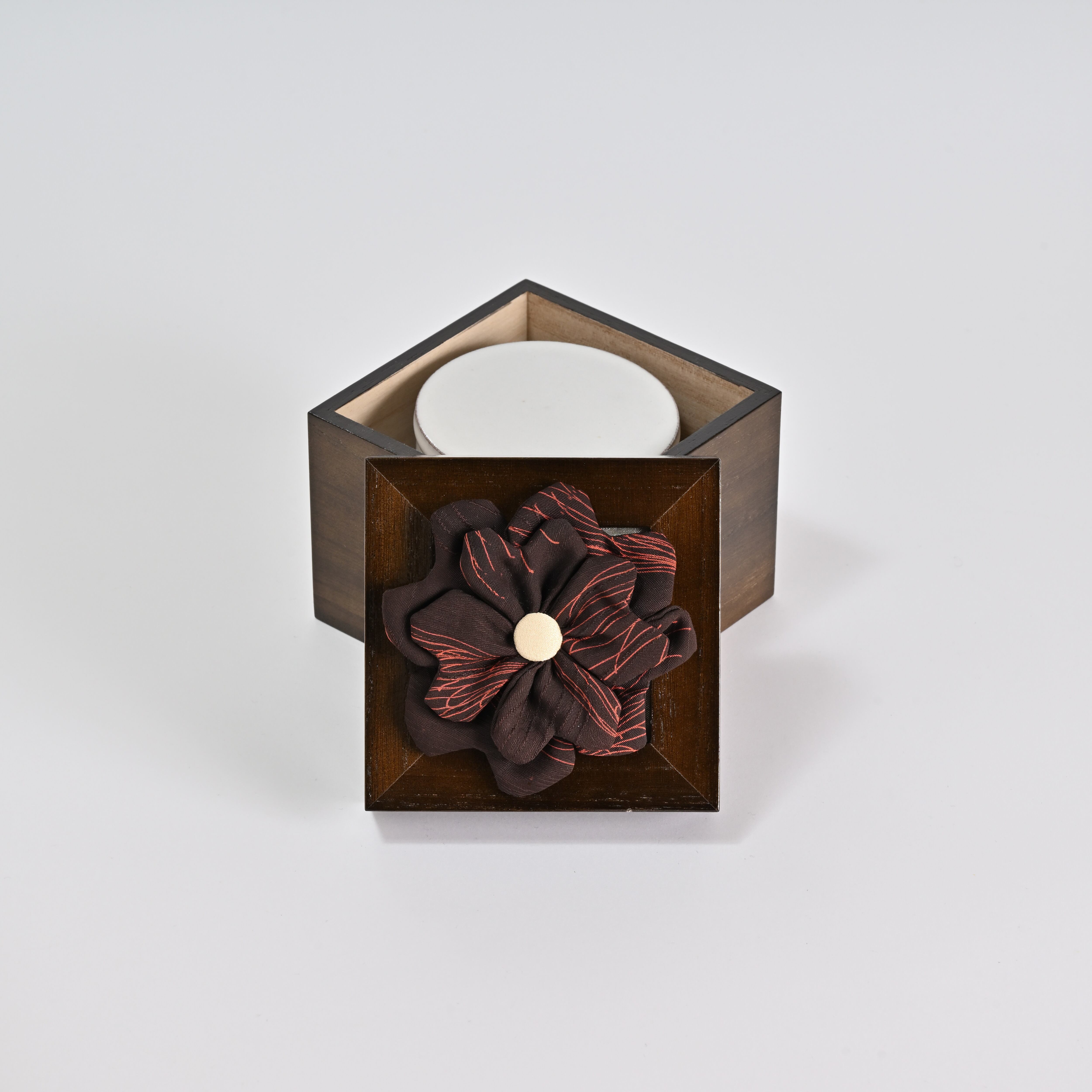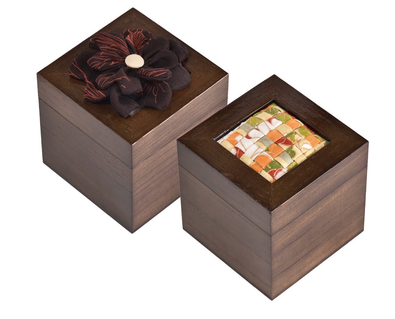 昭和29年創業の桐箱製造会社、工場併設の当店では、桐箱一筋40年の熟練職人監修の安心感安定感があります。また蓋上部のメッシュワークまたはダブルクローバーはパッチワーク師範科卒業のパッチワーク講師「村井圭子氏」が丁寧に作り込みました。