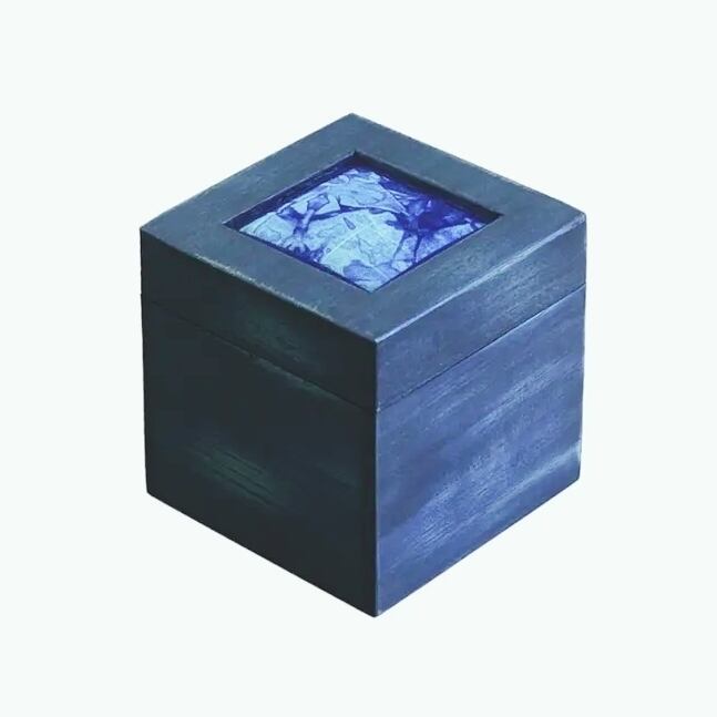 『阿波藍 CUBEメモリアル® エイジング』は、藍色の濃淡を生かした伝統的な藍染め技法、むらくも染めの意匠が特徴のメモリアルボックスです。