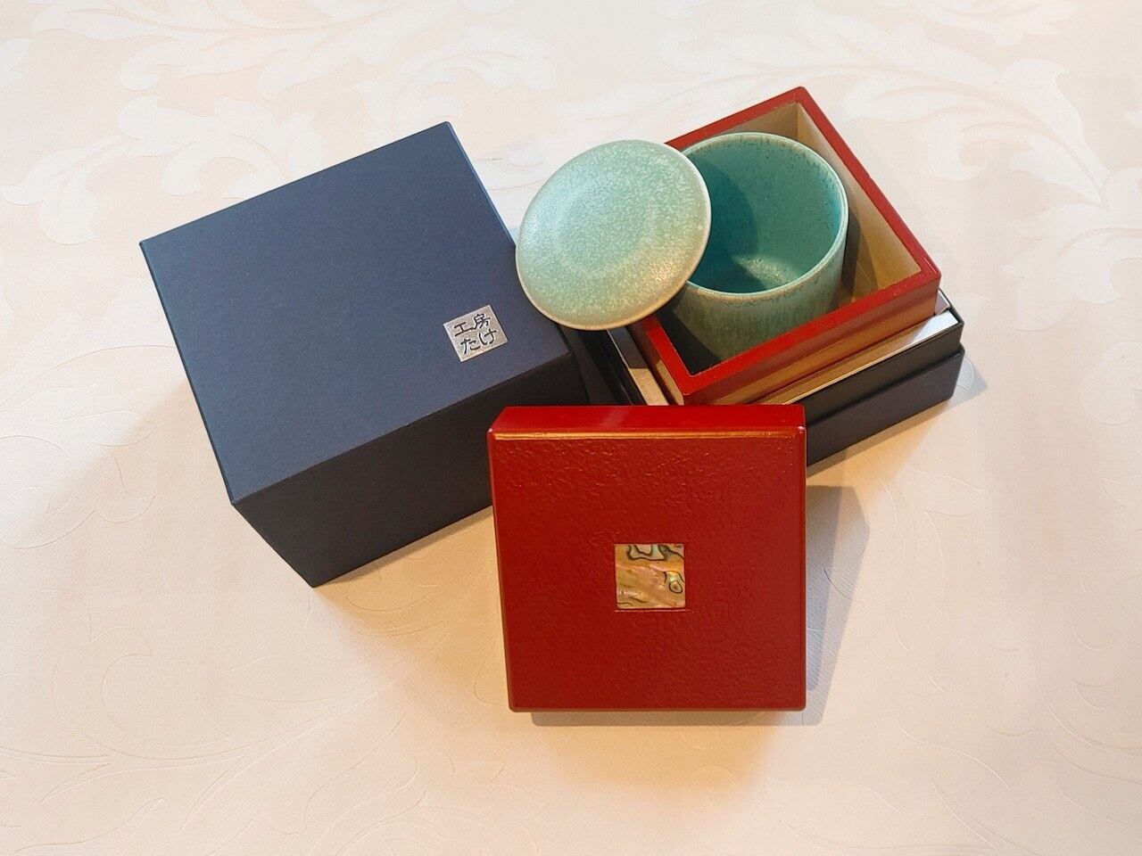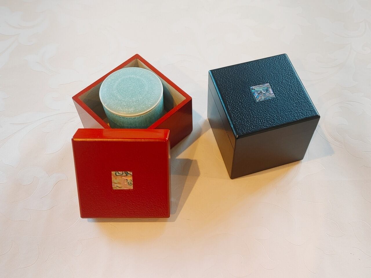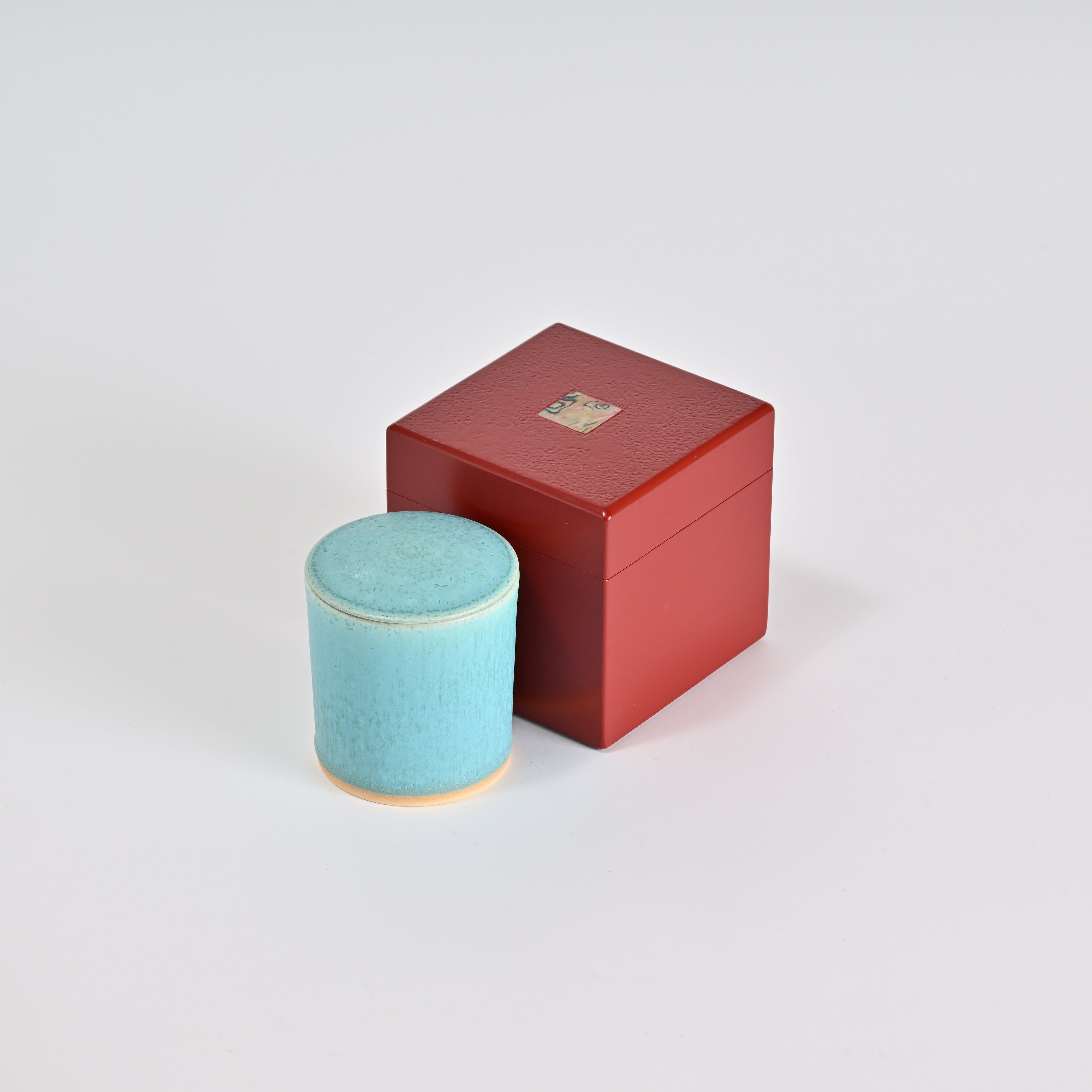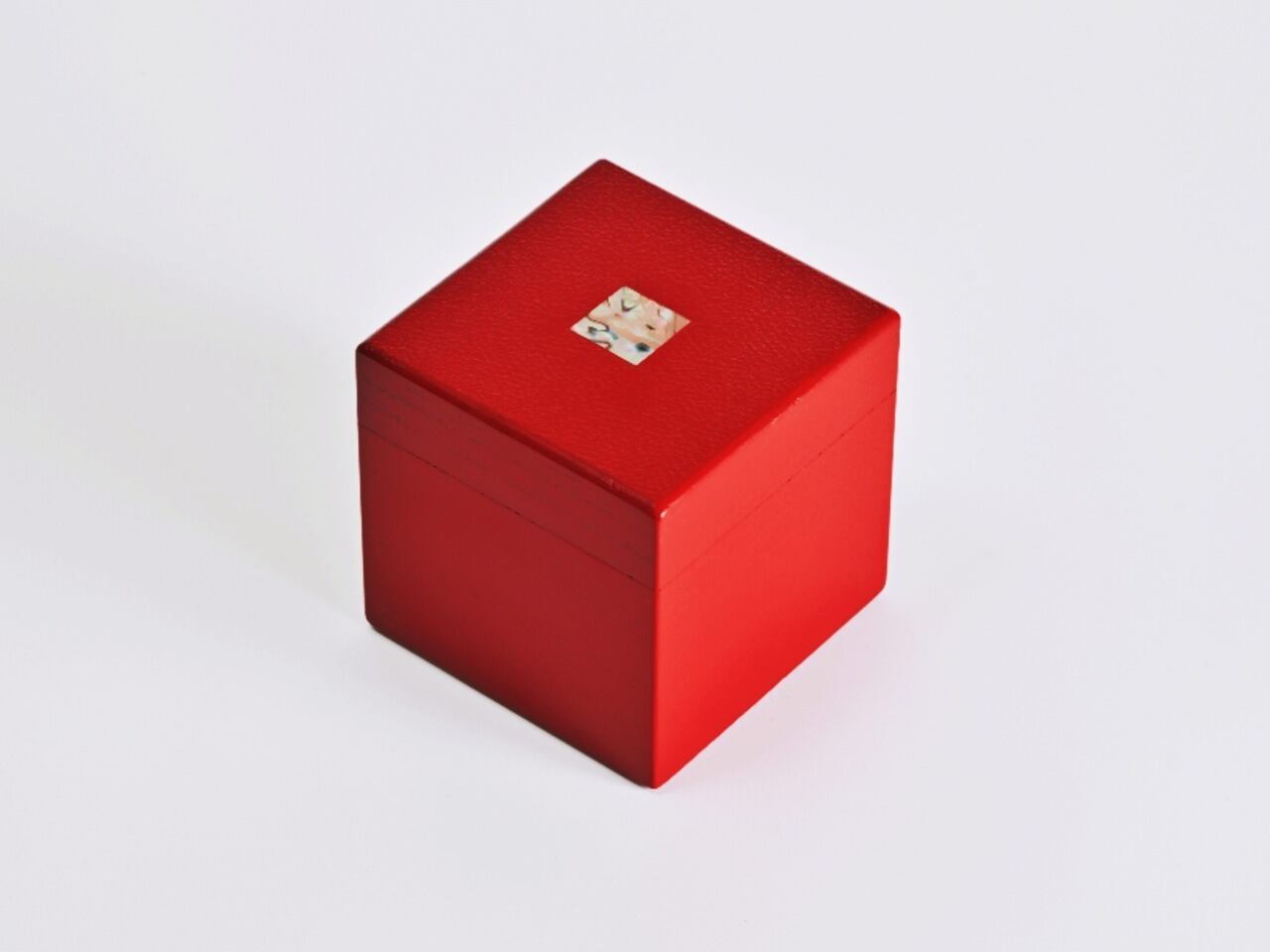 日常の空間にも自然と馴染む立方体フォルムと、華やかな赤色の漆仕上げが特徴です。