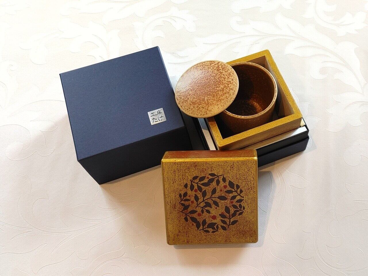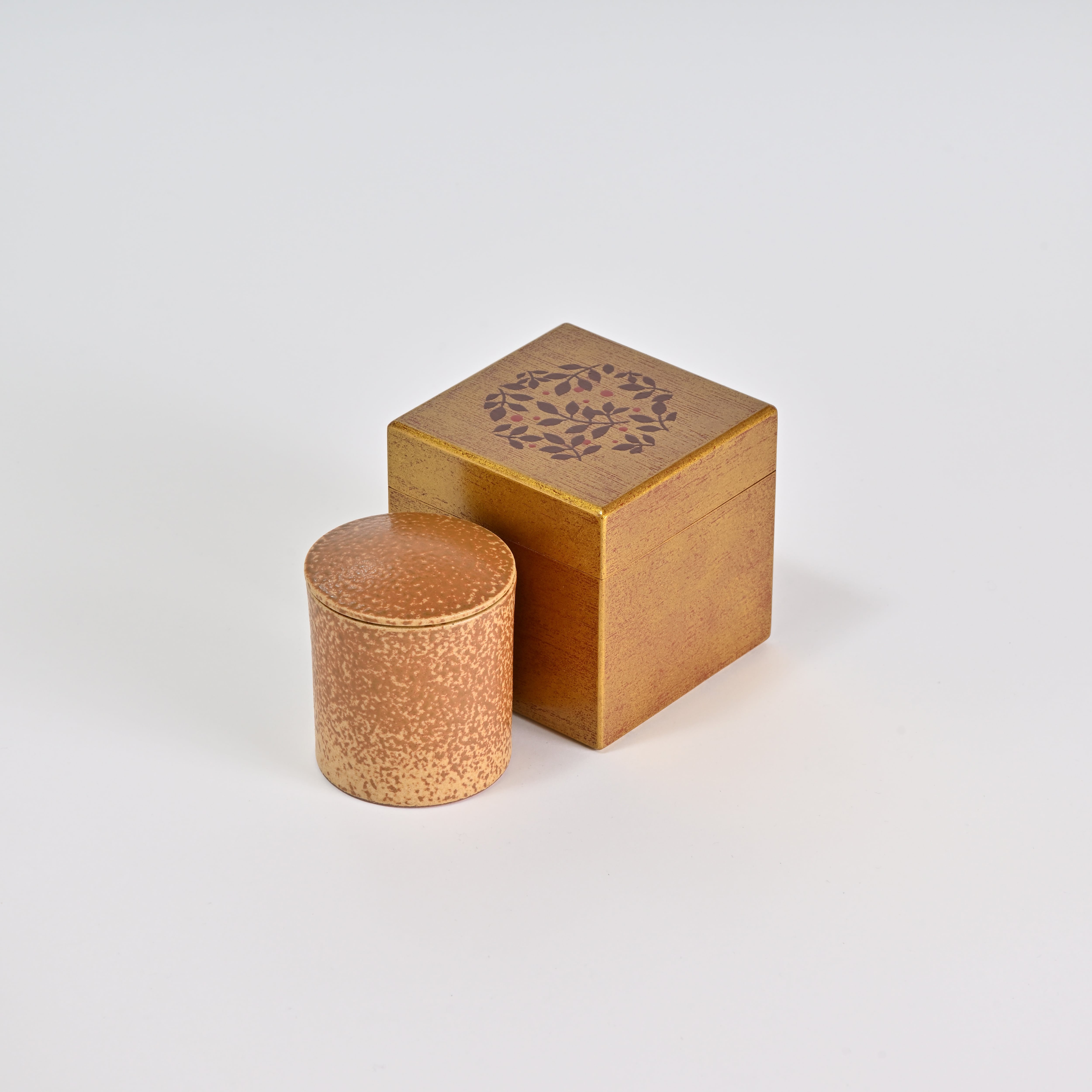 日常の空間にも自然と馴染む立方体フォルムと、高級感のある金色の漆仕上げが特徴です。
