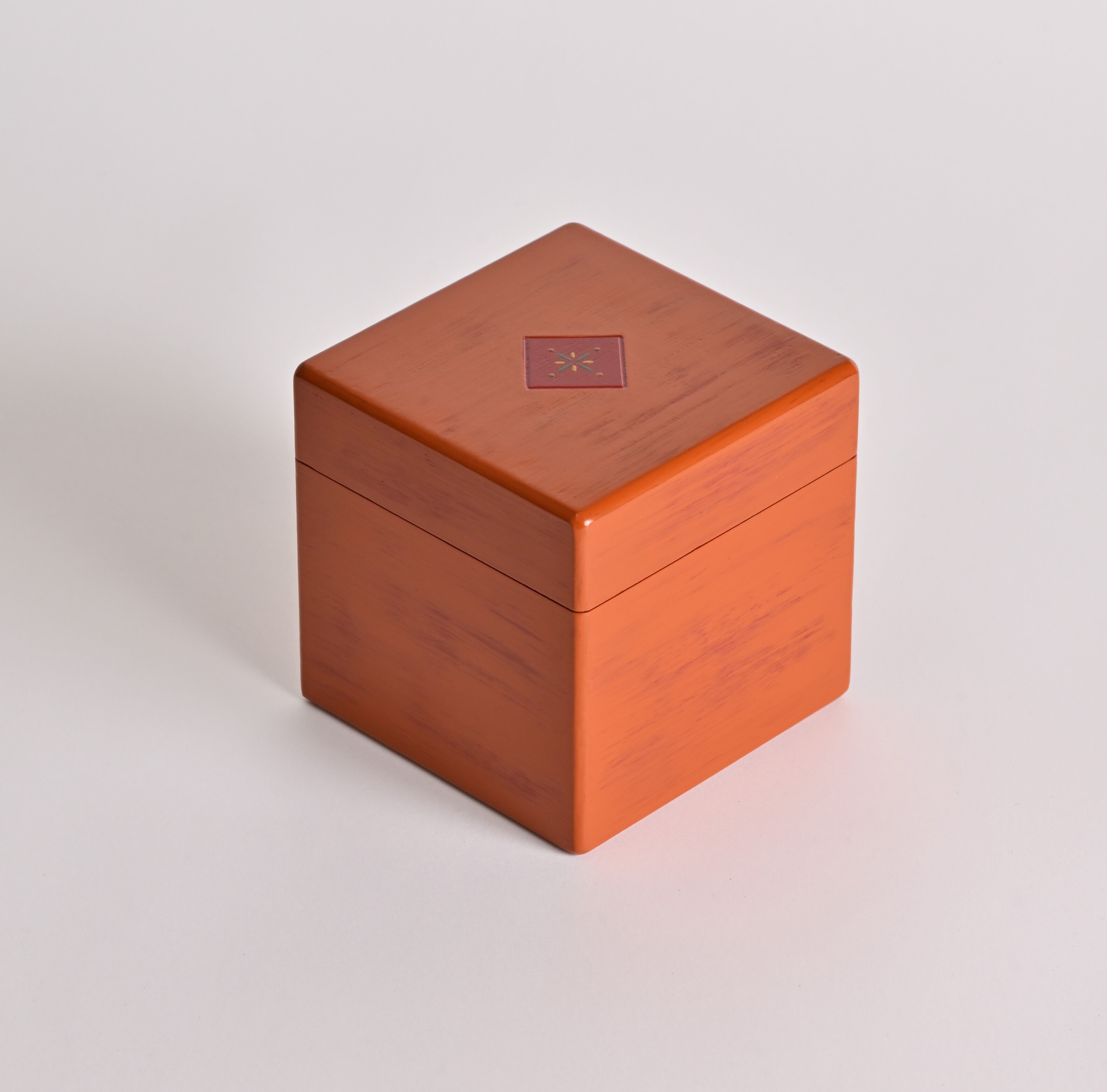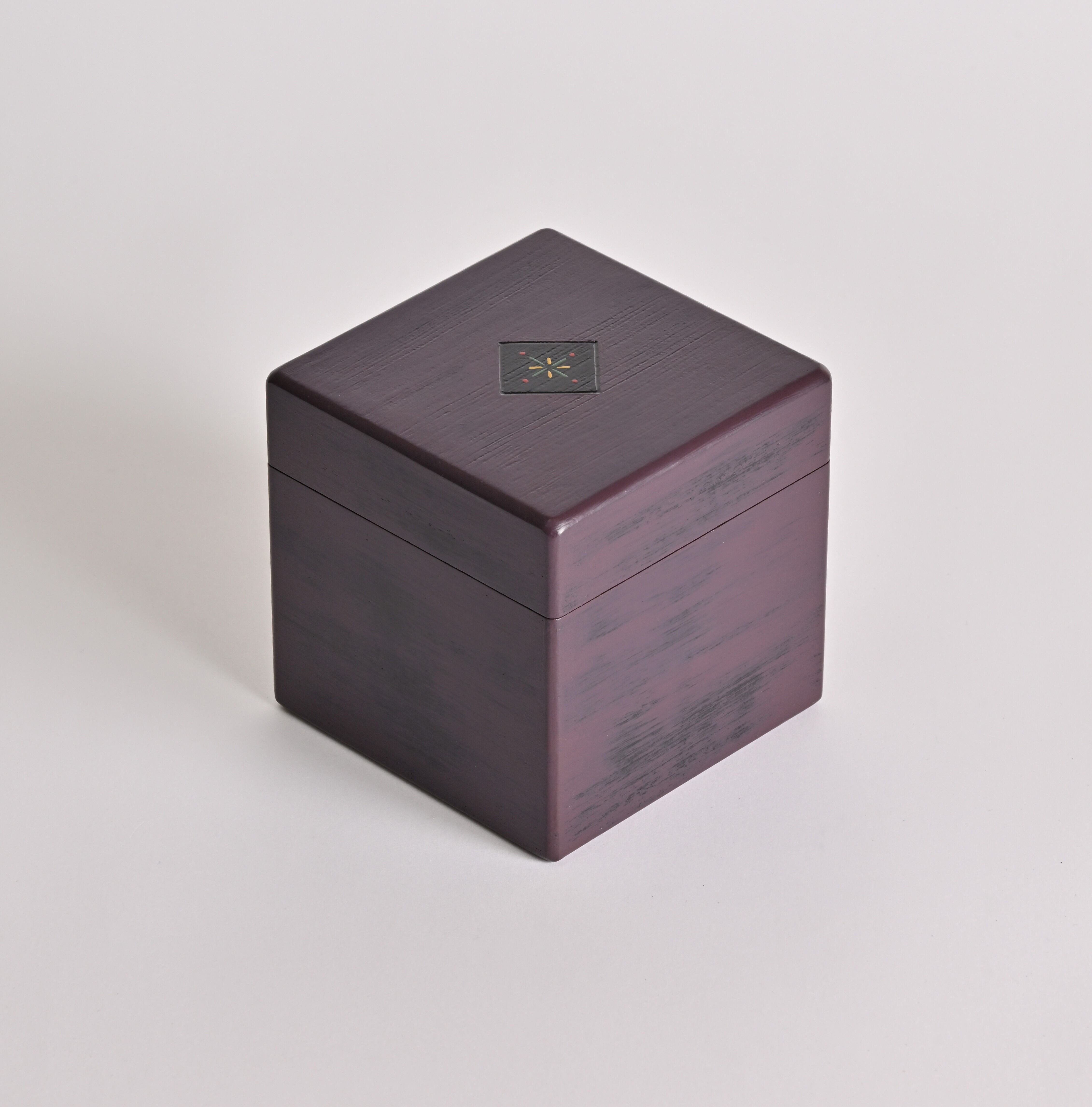 日常の空間にも自然と馴染む立方体フォルムと、カラフルな漆の仕上げが特徴です。